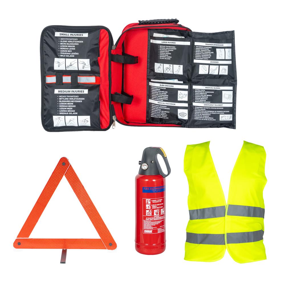 Φαρμακείο πρώτων βοηθειών, πλήρως εναρμονισμένο με τη νέα νομοθεσία, που περιλαμβάνει αποκλειστικά και κατ’ ελάχιστον όλο τον απαραίτητο εξοπλισμό, όπως αυτός ορίζεται από το ευρωπαϊκό πρότυπο DIN 13164:2022. Το σετ περιλαμβάνει επίσης πυροσβεστήρα 2kg ξηράς σκόνης με καπάκι, γιλέκο φωσφόριζέ κίτρινο και τρίγωνο αυτοκινήτου με πλαστική βάση.