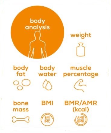 Weight, body fat, body water, muscle percentage, bone mass; AMR/BMR calorie display