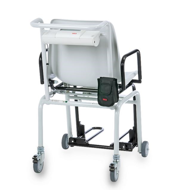 The rear wheels can lock to ensure that it is safe to sit down and stand up at all times. The positioning of the large LCD screen behind the chair makes it easy to read and the many functions (including BMI) leave nothing to be desired. With two operation modes, either with power adapter or rechargeable battery power supply, is an invaluable aid everywhere: in the rehabilitation center, orthopedic department, dialysis center, at nursing homes and in pediatrics. For example, small children who are not yet able to stand can be weighed comfortably while sitting. The practical pouch seca 471 attached to the scale stores the power adapter. The seca 959 is also available with intergrated RS232 interface.