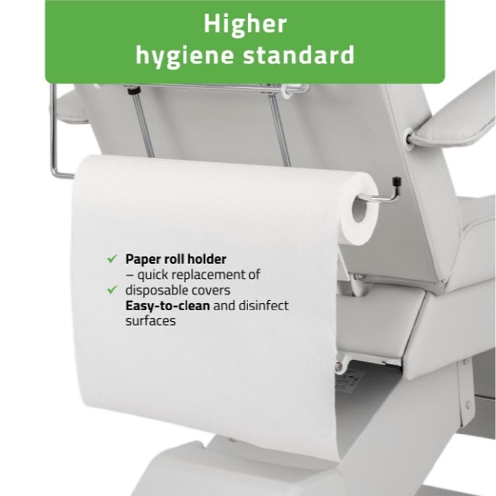 - Adjustable backrest and footrest - The hydraulic adjustment mechanism allows smooth positioning of the backrest and footrest angles. This enables the chair to be quickly set to a lying position, suitable for a wide range of beauty and care treatments.