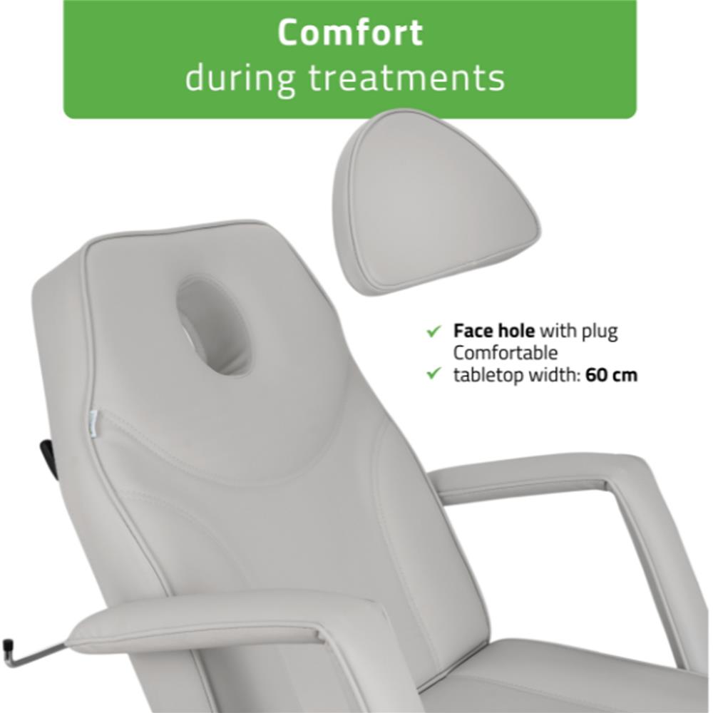 Its versatile design and wide range of adjustments allow for comfortable performance of various care, cosmetic, and relaxation treatments.
