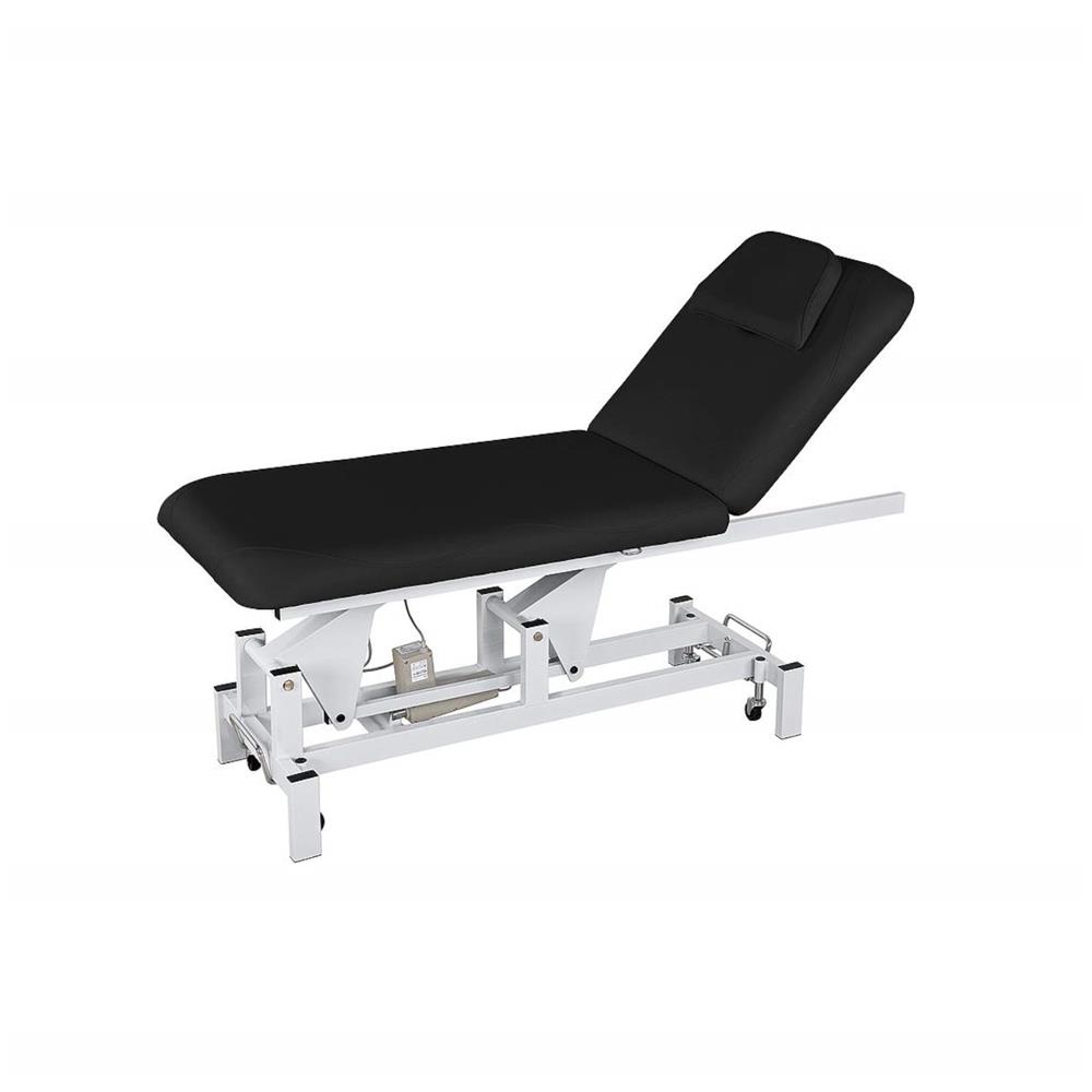 2-section bed with very solid metal structure. Equipped with 1 motor that controls height with a side button. The back is adjustable with a gas lift. Armrest headrest with breathing hole. Retractable wheels for easy movement. High quality white PU wallpaper for easy cleaning. Paper-roll holder is included.