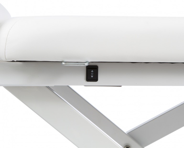 2-section bed with a very stable metallic structure that is equipped with 1 motor that controls the table height by a lateral button built in the structure. Backrest adjustable by gas lift. Removable and adjustable headrest. 2-wheel system to facilitate its mobility. White PU upholstery of high quality that eases cleaning.