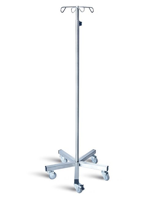 I.V. trolley stand on 5 wheels, stainless steel with 4 hooks