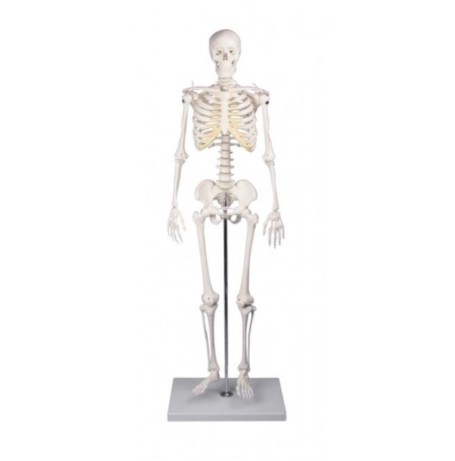 Scaled down reproduction of a human skeleton in about half life size. Skull, arms and legs can be disarticulated. The skull can be disassembled in three parts.