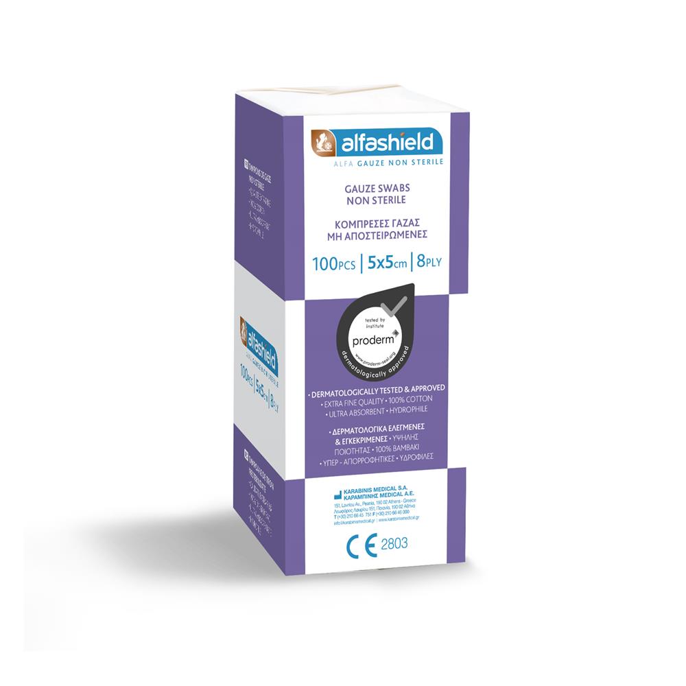 Οι μη αποστειρωμένες γάζες ALFA GAUZE/ Alfashield κατασκευάζονται από 100% άριστης ποιότητας βαμβάκι προσφέροντας μέγιστη ασφάλεια και προστασία. Είναι υδρόφιλες, μεγάλης απορροφητικότητας, άοσμες, χωρίς κατάλοιπα λευκάνσεως και διαθέτουν διπλωμένα άκρα. Ακόμη, έχουν εκλεχθεί και πιστοποιηθεί δερματολογικά ώστε να αποφευχθούν ανεπιθύμητες ενέργειες και ερεθισμοί.
